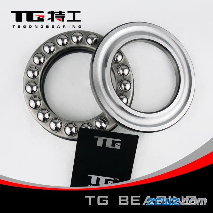 推力球軸承的套圈與滾動體多半是可分離的,接觸角為90度。有單向和雙向之分。單向推力球軸承只能承受單向軸向載荷,限制軸和外殼一個方向的軸向移動,兩個套圈的內(nèi)孔不一樣大,內(nèi)徑較小的是緊圈(軸圈),與軸配合,內(nèi)孔較大的是松圈(座圈),與機座固定在一起。極限轉(zhuǎn)速較低,適用于軸向力大而轉(zhuǎn)速較低的場合。雙向推力球軸承可承受雙向軸向載荷,可以限制軸和外殼兩個方向的移動,中間套圈為緊圈,與軸配合,另兩套圈為松圈。高速時,由于離心力大,球與保持架因摩擦而發(fā)熱嚴(yán)重,壽命較低。常用于軸向載荷大、轉(zhuǎn)速不高處。
